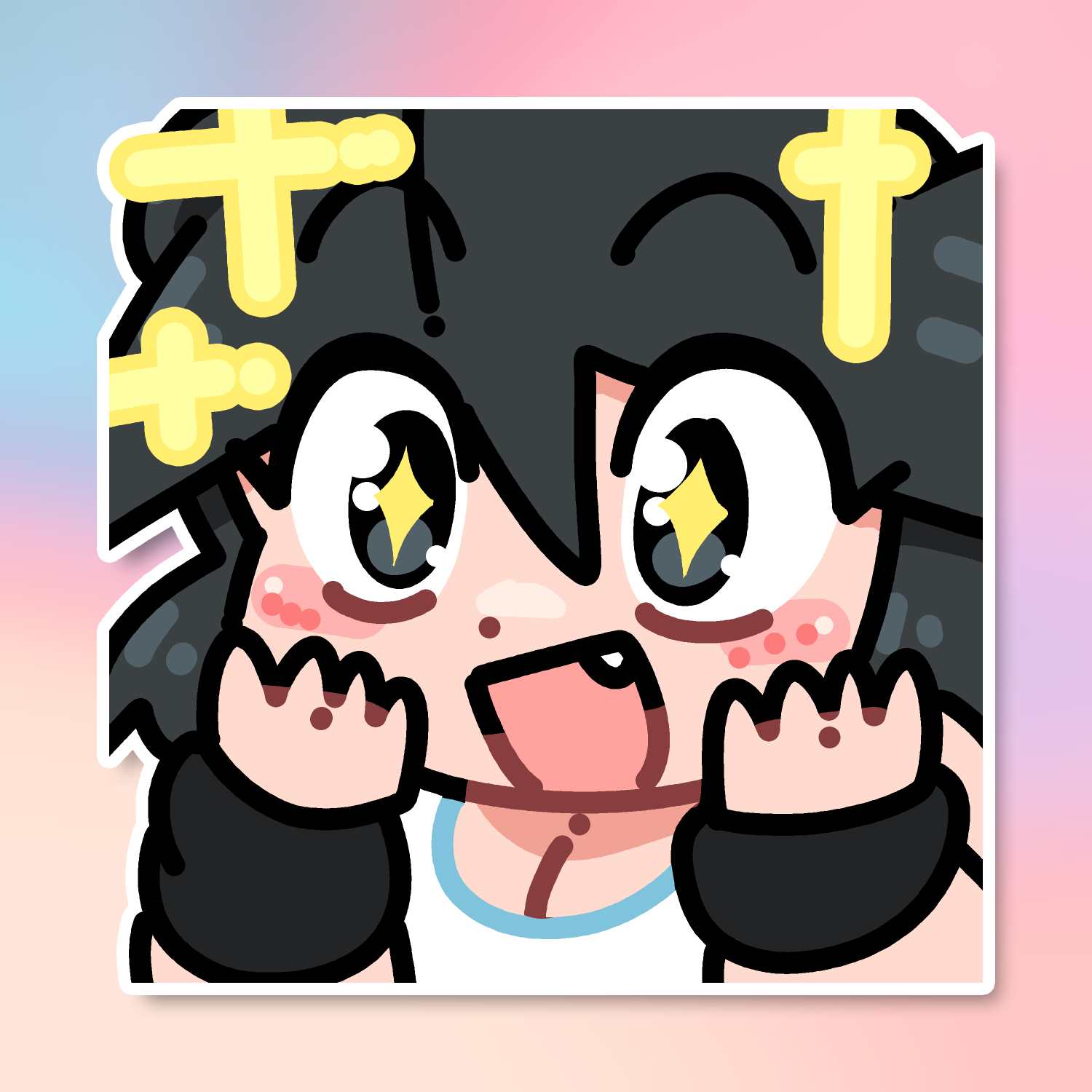 All of our stickers are die-cut and made-to-order. This sticker is available in three different sizes, 2 inches, 4 inches, and 6 inches, and the 4 and 6 inch versions are available in three variants: standard, holographic, and laminate.